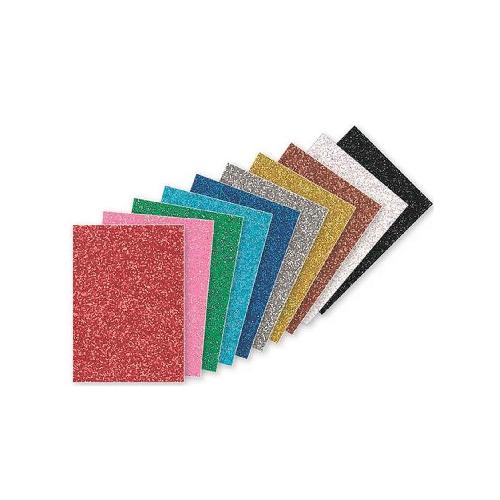 Confezione da 10 fogli di gomma EVA glitterata in 10 colori assortiti, ideale per progetti di artigianato, decorazioni, scrapbooking e attività creative. Morbida, resistente e facile da ritagliare o modellare, ogni foglio aggiunge un tocco brillante e originale a lavoretti, biglietti, composizioni e decorazioni, rendendo ogni creazione unica e scenografica.