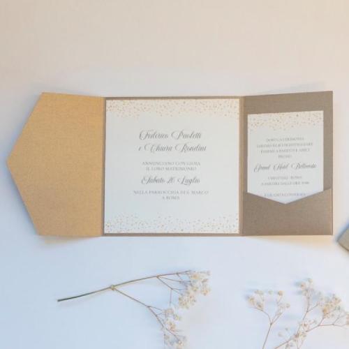 La cover quadrata con tasca Kartos nel formato 15,5×15,5 cm è realizzata in cartoncino da 300 g nel prezioso colore oro, perfetta per partecipazioni, inviti e coordinati grafici eleganti e raffinati. La tasca interna consente di inserire facilmente cartoncini, messaggi o fogli stampati, garantendo una presentazione ordinata e curata. La superficie liscia e luminosa valorizza la brillantezza del colore, conferendo un effetto sofisticato ideale per matrimoni, anniversari, cerimonie e occasioni speciali. Grazie all’elevata grammatura, la cover offre stabilità e resistenza, proteggendo il contenuto e mantenendo la forma impeccabile nel tempo. Il cartoncino è compatibile con stampa inkjet e laser e può essere impreziosito con nastri, sigilli in ceralacca o decorazioni creative per creare coordinati unici e personalizzati. La confezione da 10 pezzi rappresenta una soluzione pratica e versatile per tipografie, wedding planner e creativi che desiderano realizzazioni eleganti, curate e di grande impatto visivo.