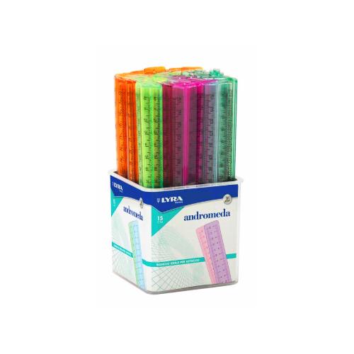 Righello Andromeda da 15 cm, ideale per scuola, ufficio e lavori di precisione. Realizzato con materiale resistente, è dotato di smusso e doppia millimetratura per misurazioni accurate e versatili su carta, cartoncino o altri supporti.