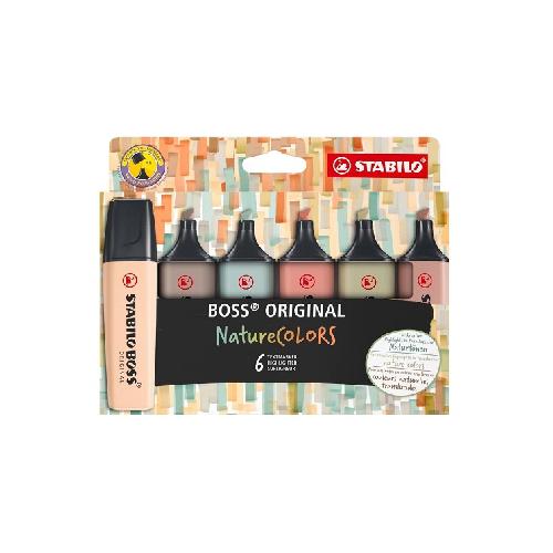 Set di 6 evidenziatori Stabilo Boss in tonalità ispirate alla natura, ideali per studio, ufficio e attività creative. La punta a scalpello consente di evidenziare testi con precisione o tracciare linee più spesse, garantendo scritte nitide e uniformi senza sbavature.