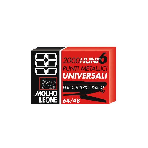 Confezione da 2000 punti universali 64/48, ideali per cucitrici e pinzatrici standard. Realizzati in metallo resistente, garantiscono fissaggi rapidi e sicuri su documenti, fogli e materiali di uso quotidiano in ufficio o a casa.